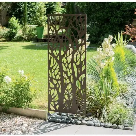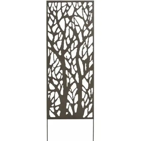 Panneau décoratif en métal avec motifs ajourés, à planter en terre ou à fixer sur un mur. Il peut accompagner la croissance de plantes grimpantes.
