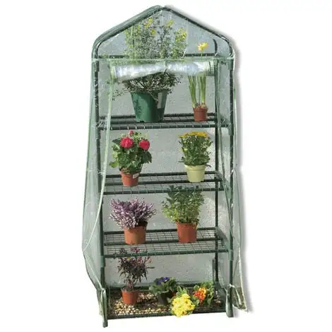 Mini serre pour balcon sur 4 étages, le Balcony 4, muni de sa couverture transparente en PVC vous permettra à la fois de ne pas perdre de place sur votre balcon ou terrasse mais aussi et surtout de couvrir vos semis et plantes durant l’hiver. 4 étagères amovibles. Couverture en PVC transparent avec porte équipée de zips. Dimensions : hauteur 1,58 m largeur 70 cm profondeur 50 cm.